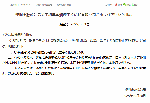 据一线财经新闻11月6日消息,深圳市金融监管局近日下发了关于胡浩先生担任华润深圳投资信托有限公司董事长任职资格的批复,核准胡浩先生担任华润深圳投资信托有限公司董事长的任职资格。
